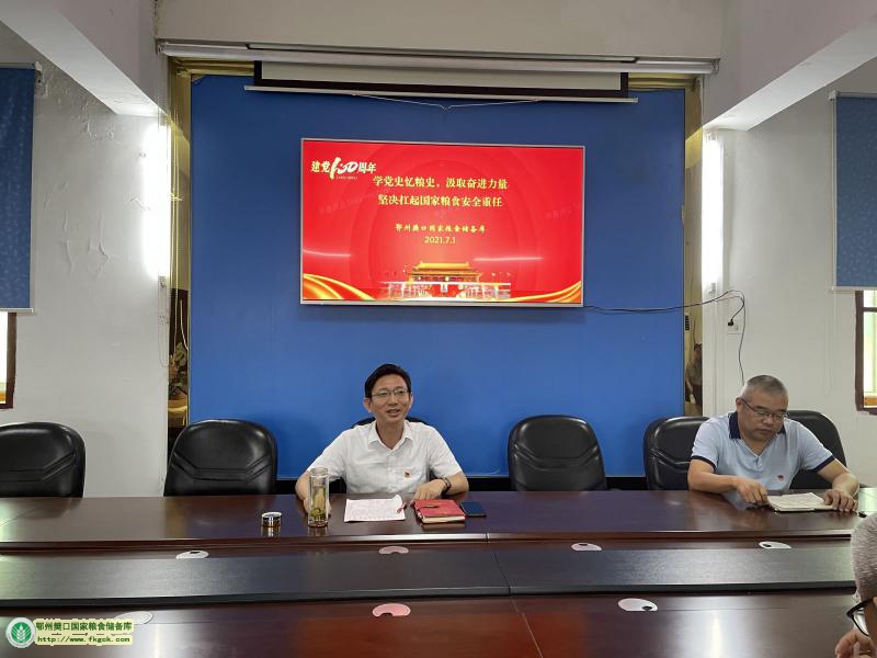 7月1日8时,樊口粮库组织全库党员、职工观看了庆祝中国共产党成立100周年大会,认真聆听习近平总书记重要讲话。随后,库党总支副书记、经理刘汉胜以“学党史忆粮史,汲取奋进力量,坚决扛起粮食安全重任”为主题,为全库职工上了一堂内容丰富、事例鲜活的专题党课。通过书记讲党课的形式,让全库每一名党员、职工缅怀革命先烈丰功伟绩,汲取不断前行的力量,以高涨的热情投身联开关室安全保障事业。