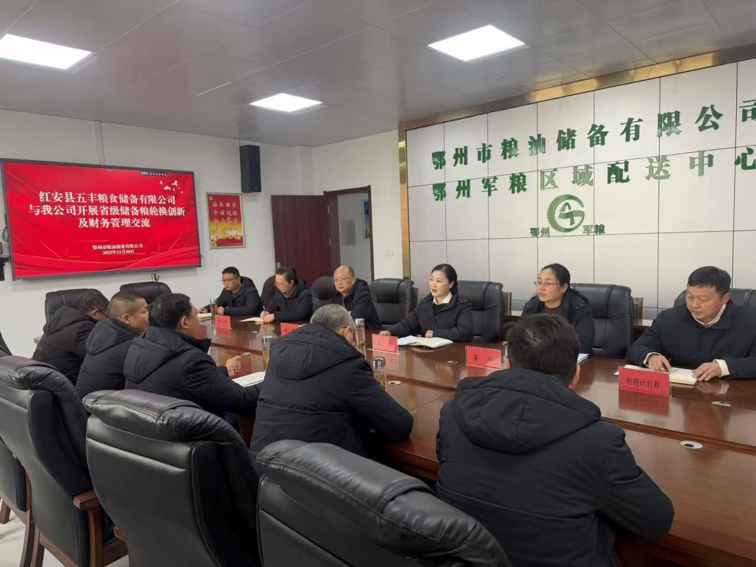 2025年12月30日,红安五丰粮食储备有限公司党支部书记、总经理郑保华一行莅临鄂州市粮油储备有限公司,开展业务交流座谈。双方紧扣粮食购销计划、财务管理等核心业务,深入交流经验、凝聚合作共识。